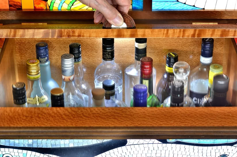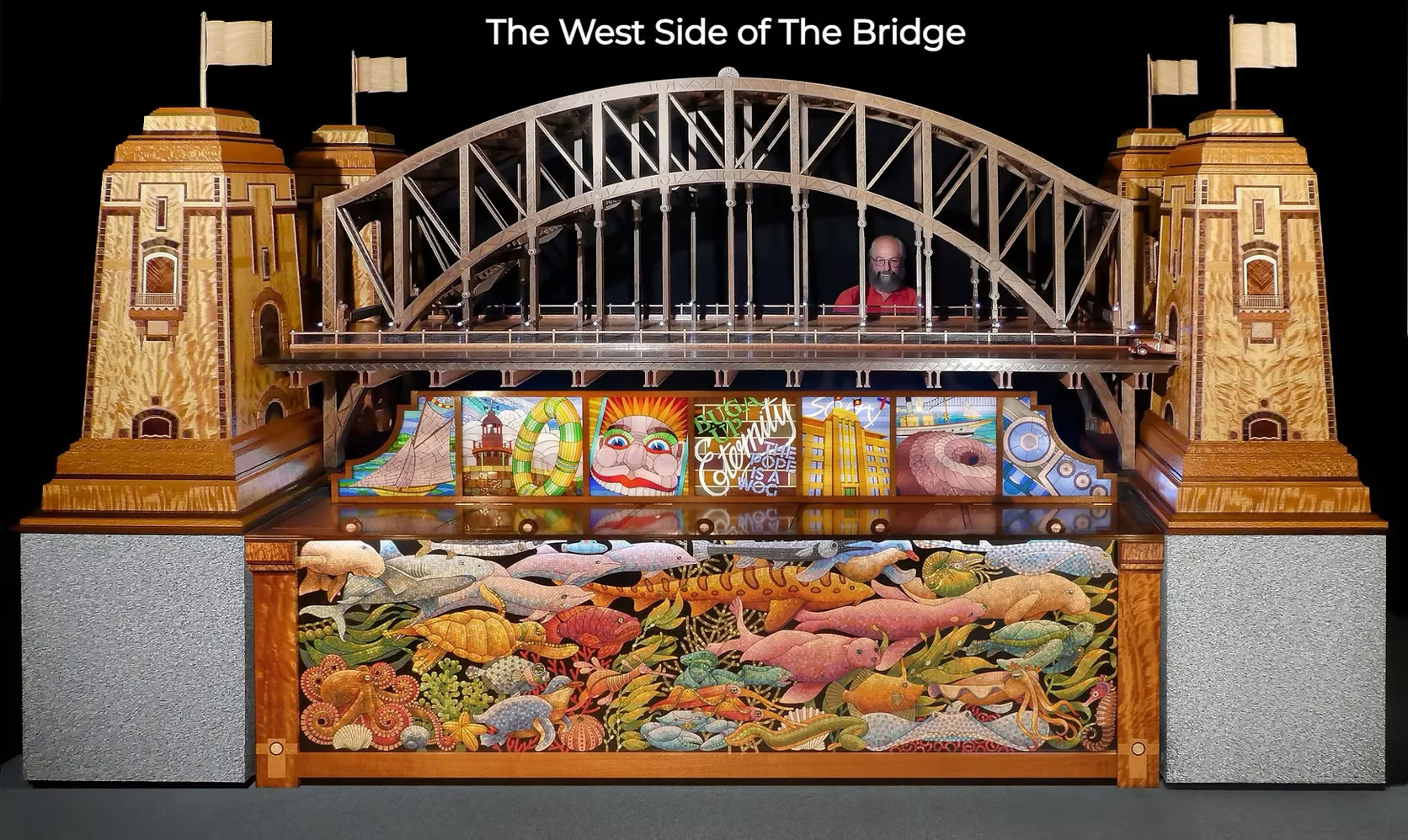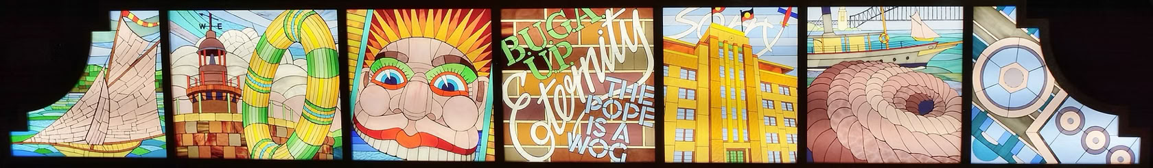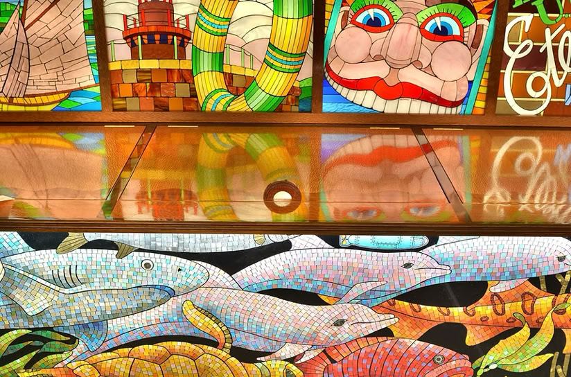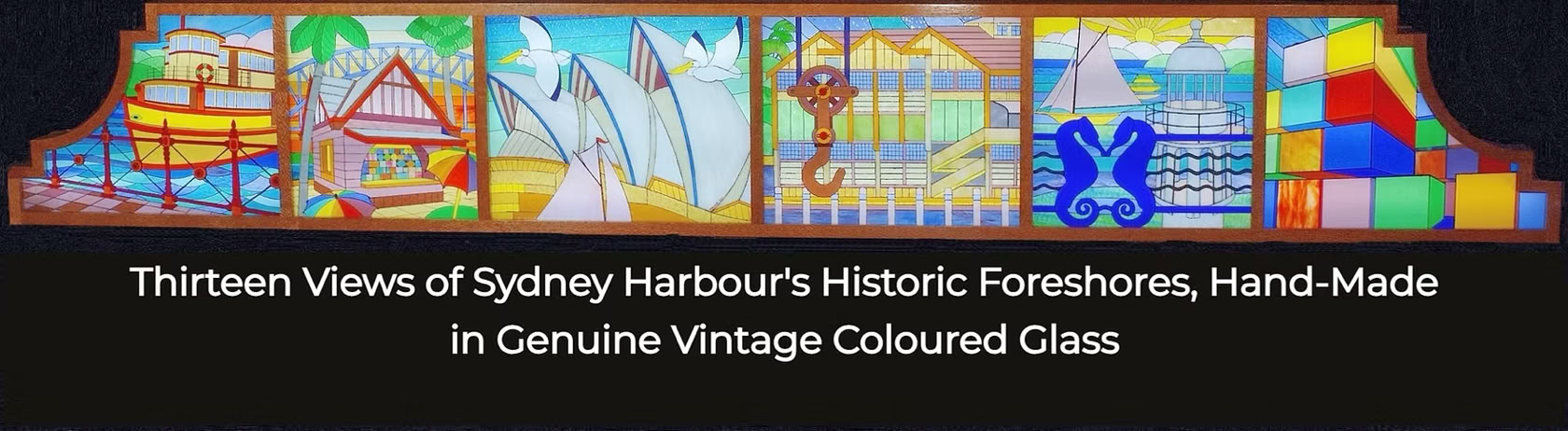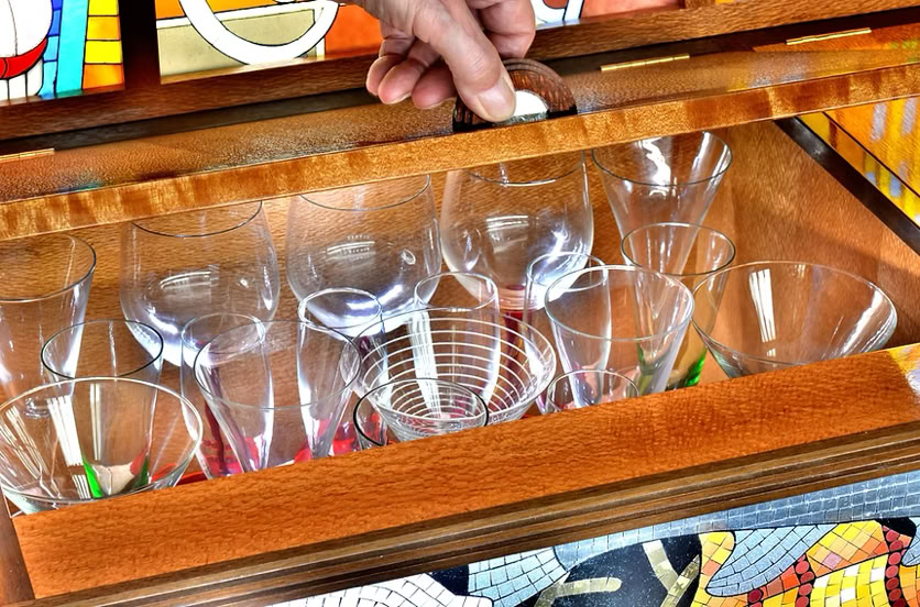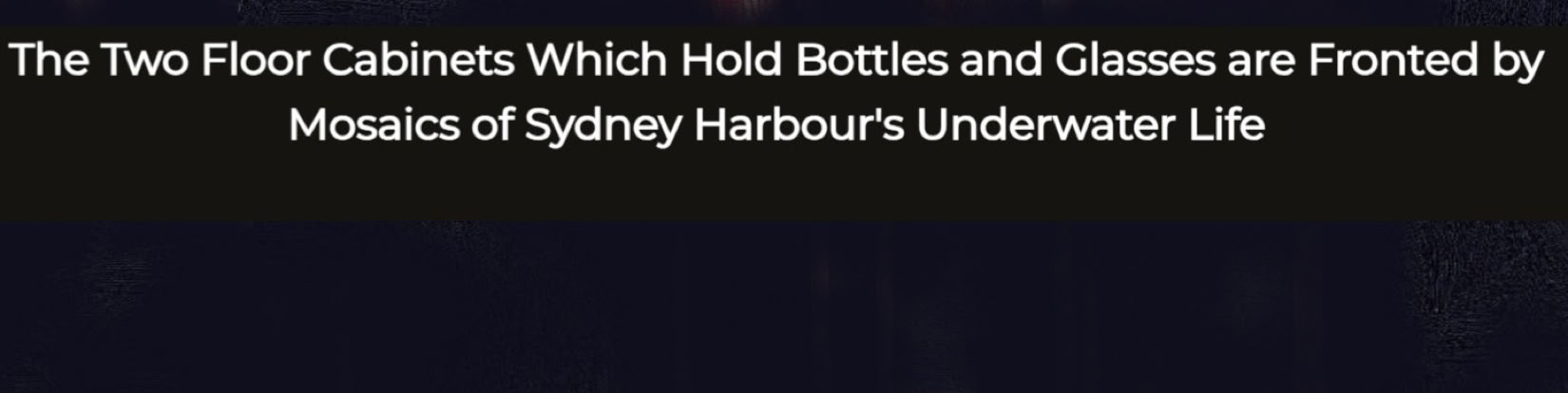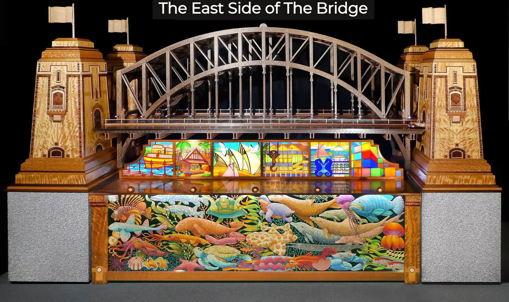 It takes the form of a huge, fully-functional cocktail cabinet - not only the gorgeous Bridge itself, but also featuring 13 views of Sydney Harbour's foreshore attractions, made by hand in vintage coloured glass, and beneath the surface, Sydney's underwater life done in mosaic.
