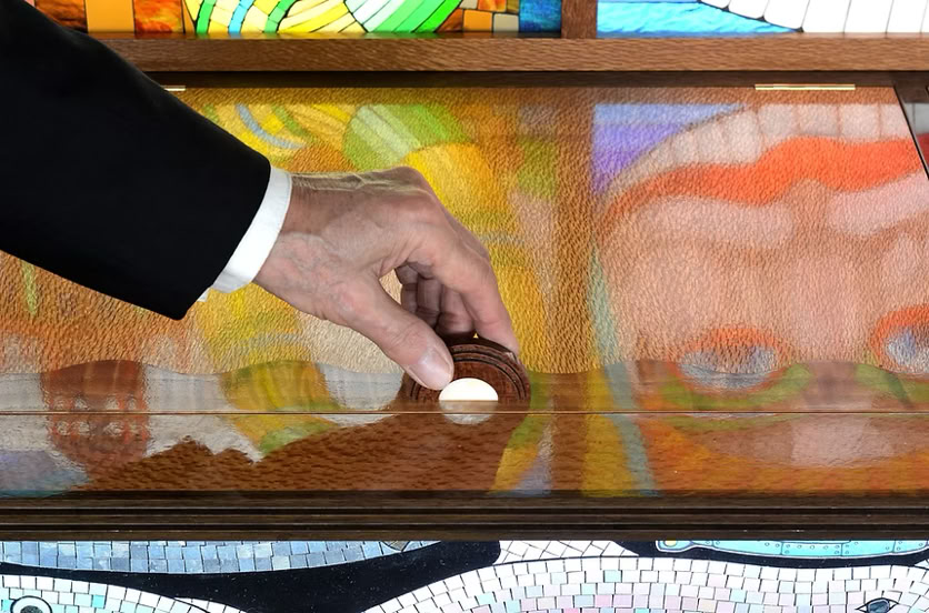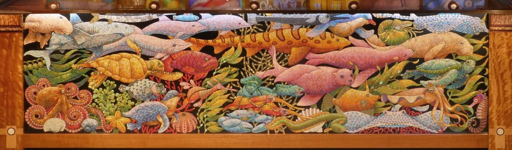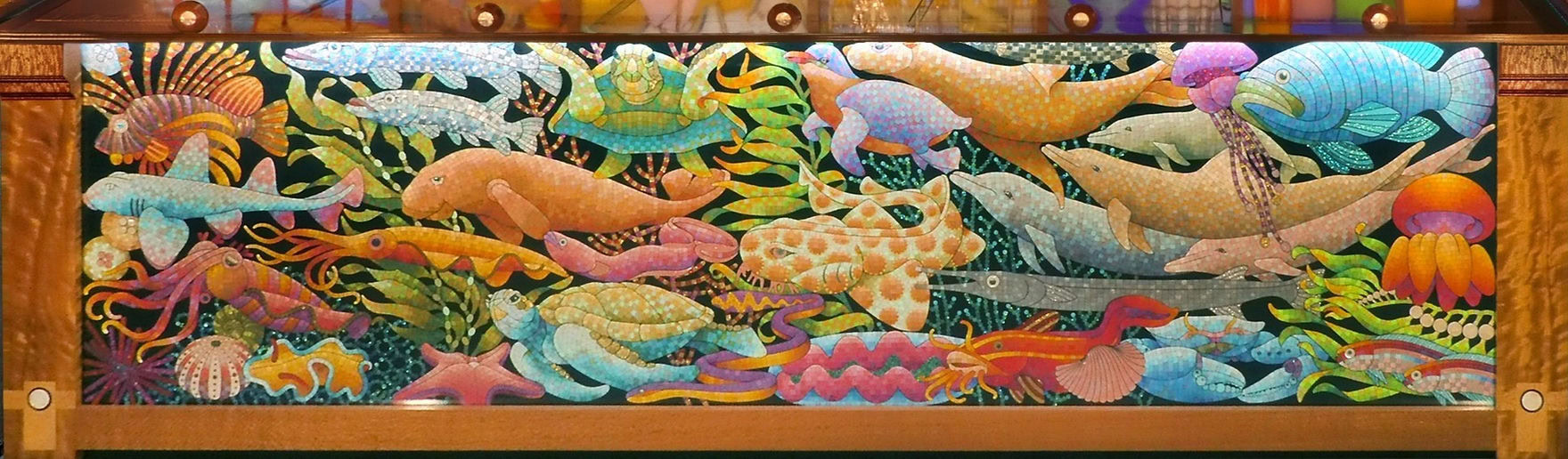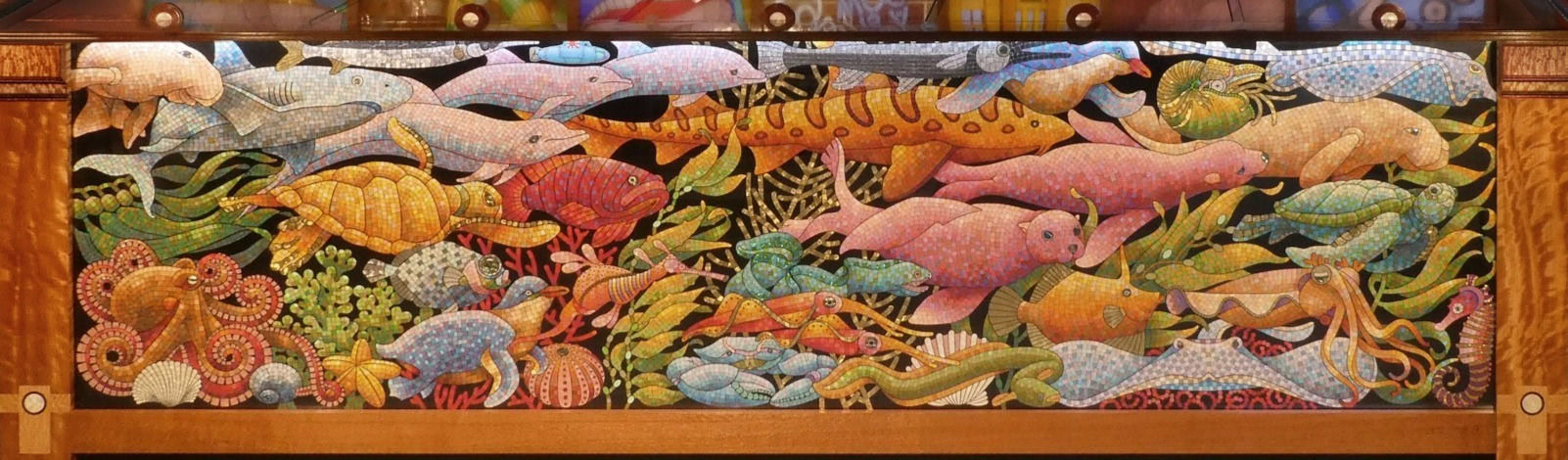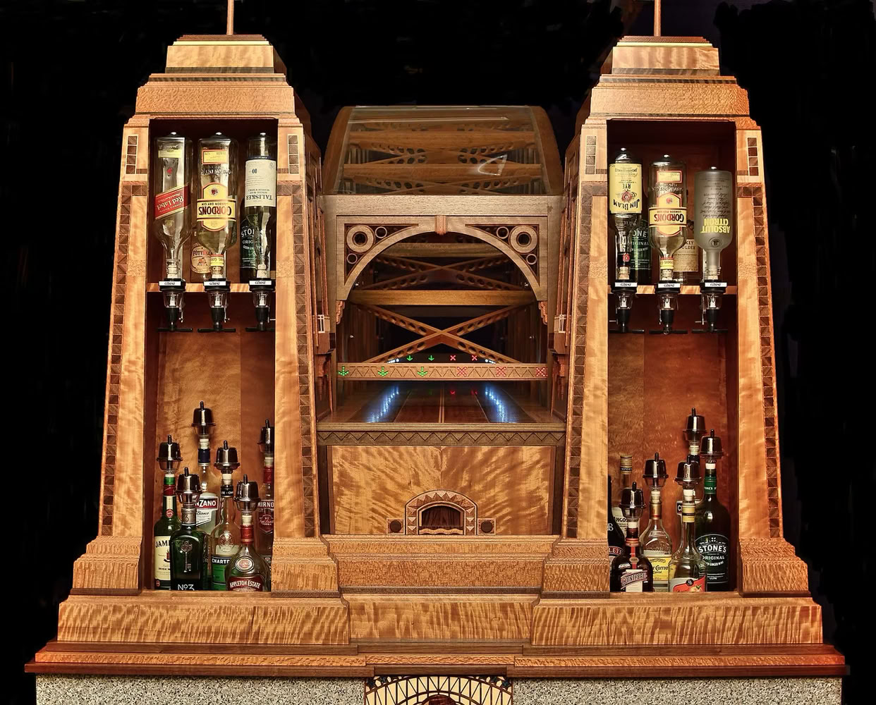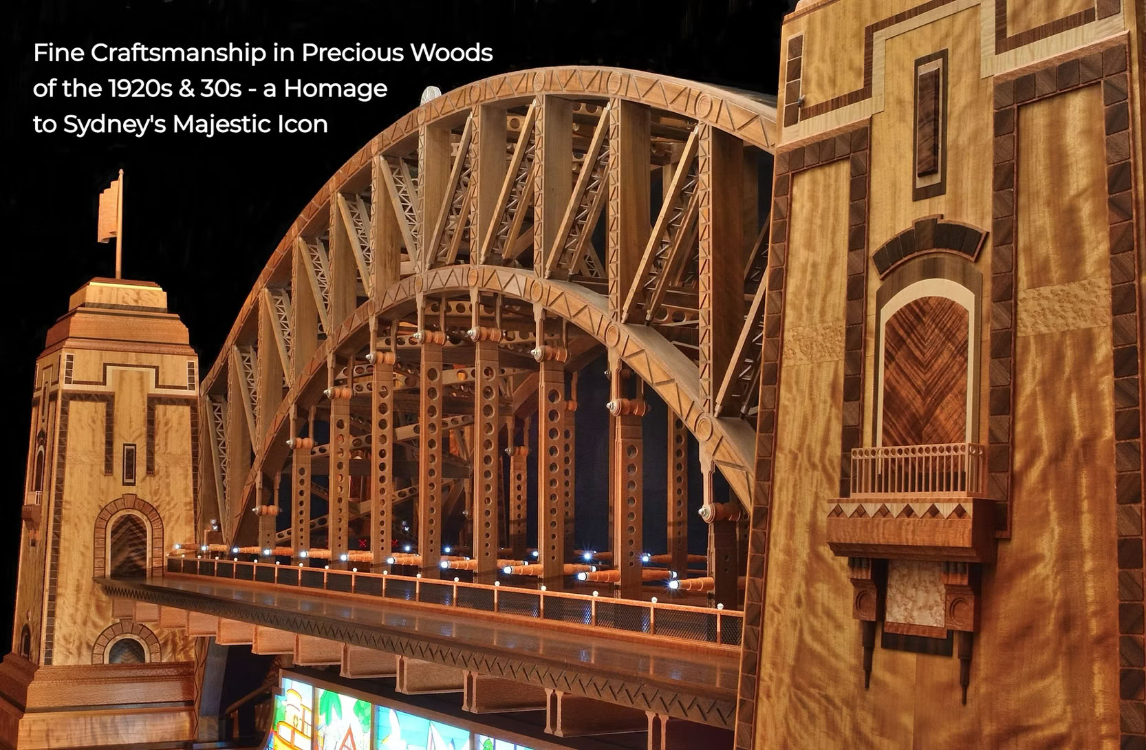 It takes the form of a huge, fully-functional cocktail cabinet - not only the gorgeous Bridge itself, but also featuring 13 views of Sydney Harbour's foreshore attractions, made by hand in vintage coloured glass, and beneath the surface, Sydney's underwater life done in mosaic.