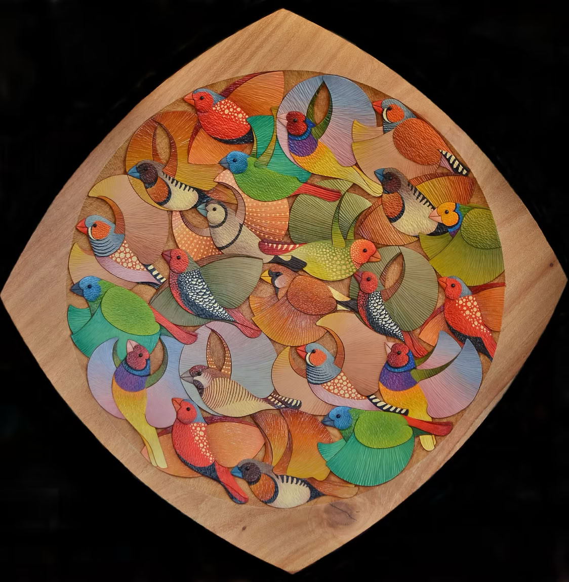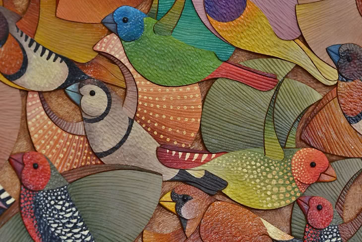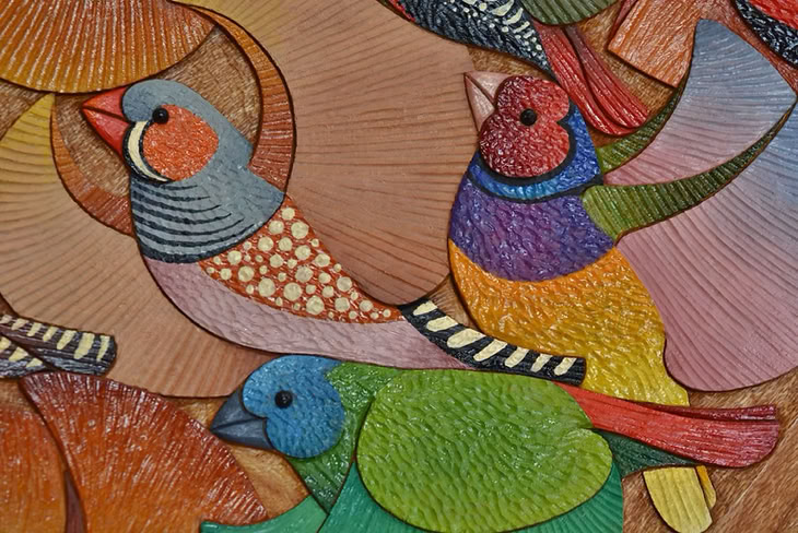 My humble offering is The Finches Platter, carved from a Sydney Silky Oak tree that died in my sister, Suzie's back yard. The surface is not sanded, but left straight from the gouge, and coloured using